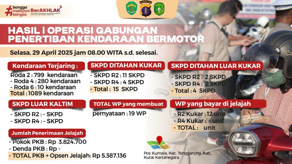 penerimaan pajak pada kegiatan Penertiban Kendaraan Bermotor bersama, Sekolah Polisi Negara (SPN), Dishub Kukar, Bapenda Kukar, Sanlantas Kukar, dan Kodim pada hari Selasa, 29 April 2025 jam 08.00 WITA s.d. selesai.