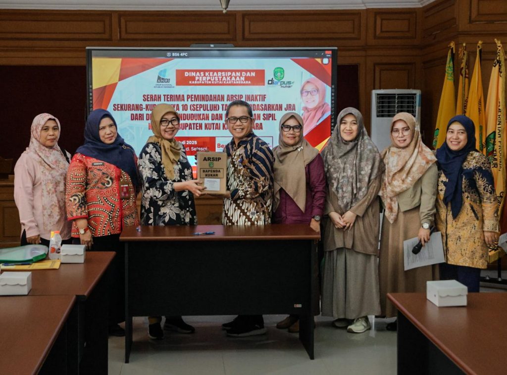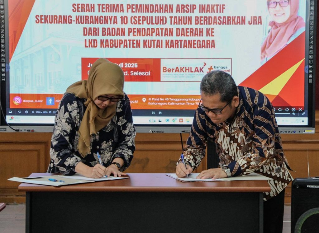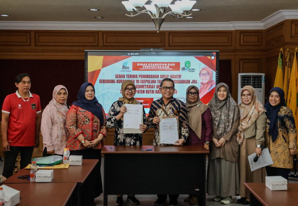 Tenggarong, 11 Juli 2025 – Upaya penguatan tata kelola kearsipan di lingkungan Pemerintah Kabupaten Kutai Kartanegara terus digencarkan. Hari ini, bertempat di ruang rapat Dinas Kearsipan dan Perpustakaan Kabupaten Kutai Kartanegara, telah dilaksanakan serah terima arsip inaktif sekurang-kurangnya 10 tahun berdasarkan Jadwal Retensi Arsip (JRA) dari Badan Pendapatan Daerah (Bapenda) Kutai Kartanegara kepada Lembaga Kearsipan Daerah (LKD) Kabupaten Kutai Kartanegara.